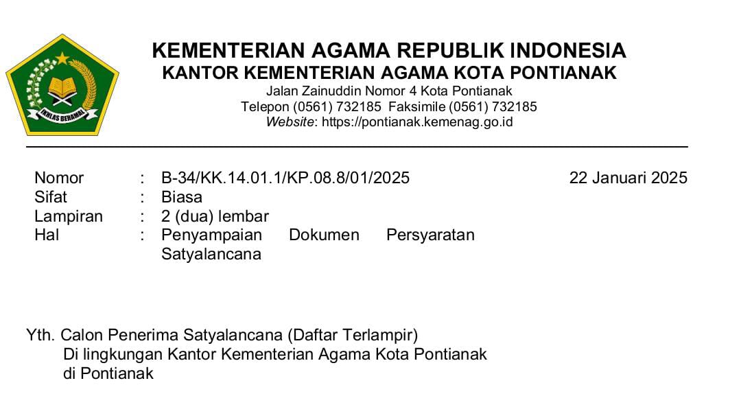 Melalui info resminya, Kementerian Agama Kota Pontianak menginformasikan terkait usulan ini untuk calon penerima dapat menyampaikan dokumen tersebut melalui tautan berikut: https://s.id/Satyalancana_HUT_RI_2025 , paling lambat pada tanggal 5 Februari 2025. Dokumen yang diupload adalah PDF Asli/Scan dari Dokumen Asli/yang telah dilegalisir, dijadikan dalam satu file PDF meliputi SK CPNS; SK Kenaikan Pangkat Terakhir; SK Mutasi/Jabatan Terakhir jika di SK Kenaikan Pangkat Terakhir ada perubahan Unor atau Jabatan, dan Piagam dan Petikan Satyalancana sebelumnya jika pegawai yang diusulkan untuk kategori XX tahun dan XXX tahun.*(shz)