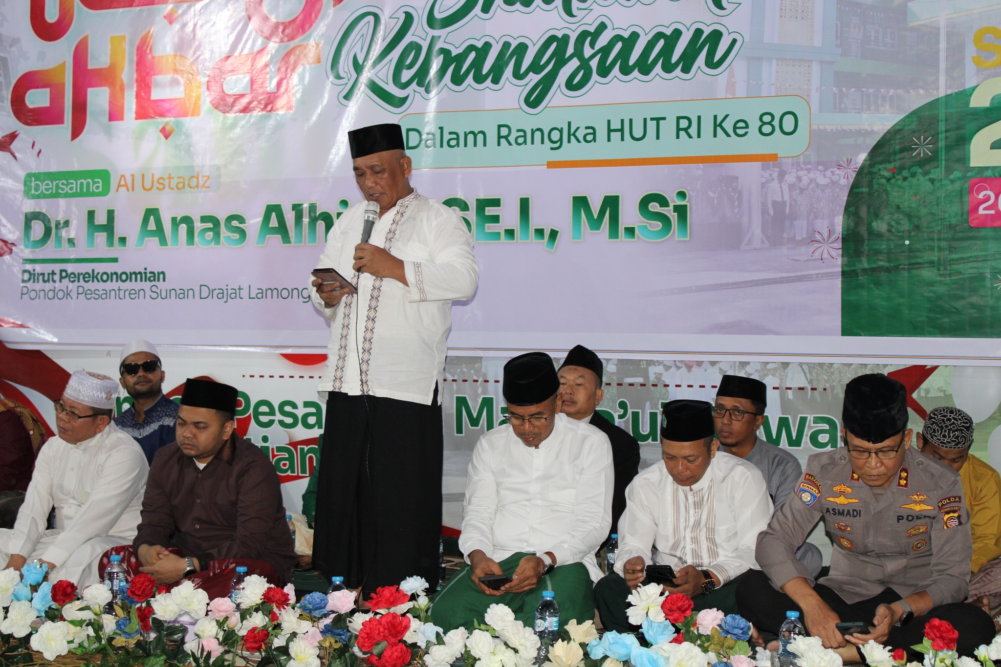 Kepala Kantor Kementerian Agama (Kemenag) Kota Pontianak, H. Ruslan, memberikan sambutan dalam acara Tabligh Akbar Semangat Kebangsaan dalam rangka memperingati Hari Ulang Tahun ke-80 Republik Indonesia. Kegiatan ini diselenggarakan oleh Pondok Pesantren Mathla’ul Anwar dan dipusatkan di ponpes setempat pada sabtu (23/08/25).